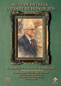 El próximo sábado 11 de abril de 2026, a las 13:30h en el Cinestudio Municipal «Antonio Espinar Arcos», tendrá lugar la entrega del reconocimiento como «Cofrade de Honor 2026» a don Manuel Fernández Rodríguez, que será presentado por don Javier Fernández Díez de los Ríos.